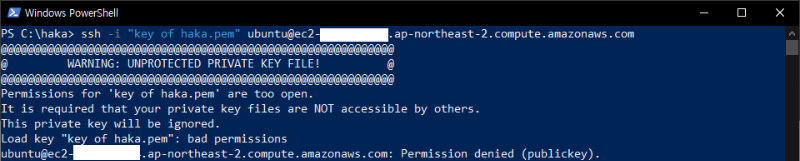 파워쉘 기준에서 다음과 같이 명령을 입력하여 리눅스 기준 chmod 400 권한을 할당한다. 파워쉘이 아닌 cmd에서 진행한다면 현재 사용자 정보인 ${env:UserName}을 %username%으로 변경해 사용하면 된다.