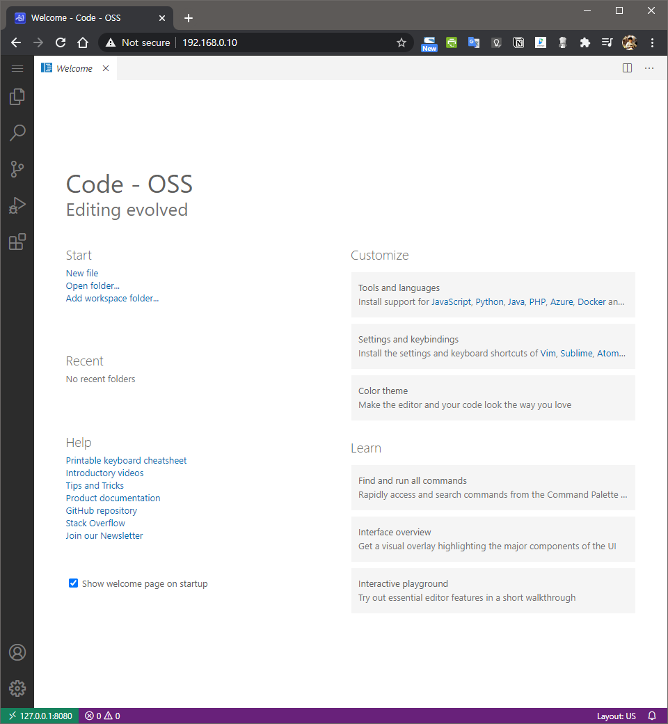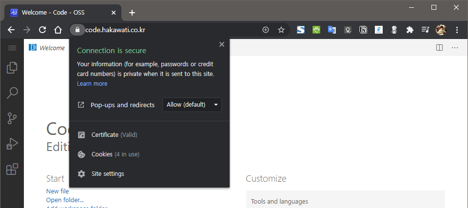 이제 https로 접속하면 code-server가 잘 동작하는 것을 확인할 수 있다.